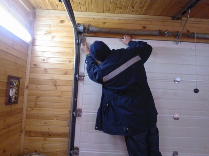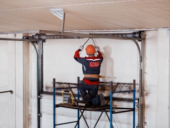 Weiter ist es notwendig, die Seitenstützen und Rollen für die Führungen zu fixieren. In den Führungen installieren Sie zuerst den unteren, dann den mittleren und dann den oberen Teil des Tors. Darüber hinaus wird jeder Abschnitt sequenziell mit Hilfe von Schleifen fixiert. Die Leinwand sollte neben allen Wänden rund um den Umfang sein. Erst danach können Sie alle zusätzlichen Mechanismen installieren. Last but not least, müssen Sie einen Begrenzer setzen, der das Niveau der anhebenden Abschnitte justiert,und wird auch für das automatische Fahren verantwortlich sein.