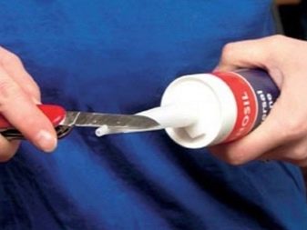 - Wenn das Dichtungsmittel nicht in einer Tube, sondern in einer weichen Verpackung gekauft wird, genügt es, die Sicherungsmutter abzuschrauben und den oberen Tülle zu entfernen. Das Paket wird in das Körpergerät eingeführt und schneidet den oberen Teil mit einem Messer. Auslauf mit Sicherungsmutter kann an seiner Stelle installiert werden.