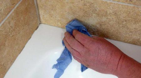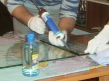 - Von der Arbeitsfläche ist es notwendig, alle Schmutz und Staub zu entfernen.Außerdem sollte der Silikonanwendungsbereich entfettet werden. Um dies zu tun, können Sie pharmazeutischen Alkohol nehmen. Nach dem Entfetten muss die Oberfläche trocknen, damit das Silikon beim Auftragen nicht austritt.