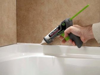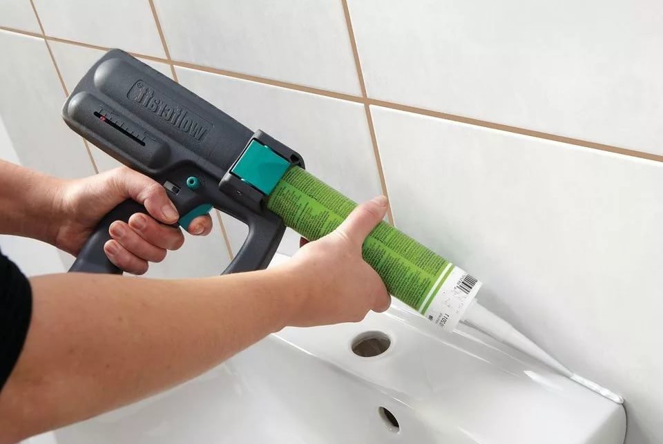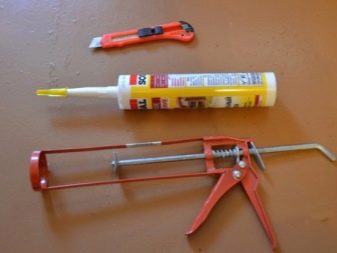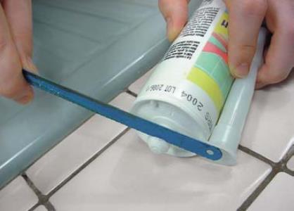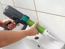 - Um die Verbindung auf die Basis aufzubringen, müssen Sie eine spezielle Silikonpistole verwenden. Bei der Versiegelung müssen Sie die Spitze abschneiden und einen Spender darauf legen. Der Cutter muss ebenfalls geschnitten werden, um den Materialfluss anzupassen.
