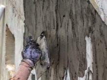 Dann wird die Oberfläche mit gewöhnlichem Wasser angefeuchtet. Während die Überlappung trocknet, bereiten Sie eine Lösung vor und mischen Sie, falls erforderlich, die Zusammensetzung mit den notwendigen Komponenten gemäß den Anweisungen des Herstellers. Die Arbeitslösung wird auf den vorbereiteten Untergrund aufgetragen, gleichmäßig verteilt und nivelliert. Die zweite Schicht kann mit ihrer konstanten Feuchtigkeit in zwei oder drei Tagen auf die erste aufgebracht werden. Als nächstes wird die dritte Schicht mit der Methode der "nassen" Anwendung aufgetragen, das heißt, die Oberfläche, auf der das Spray aufgetragen wird, sollte feucht sein.