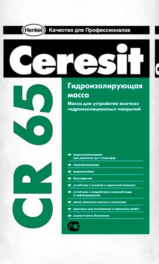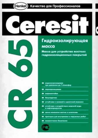 - Ceresit CR 65 - eines der besten Materialien mit hoher Leistung, hat eine Verpackung von 25 kg. Erzeugt einen starken Film, der gegenüber Dampf inert und gegen niedrige Temperaturen beständig ist. Es wird zweimal auf die Oberfläche aufgetragen und bildet eine wasserdichte Beschichtung.