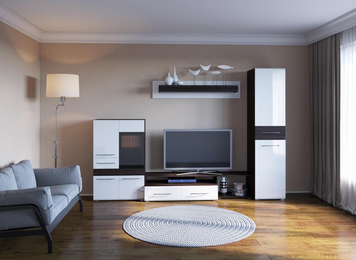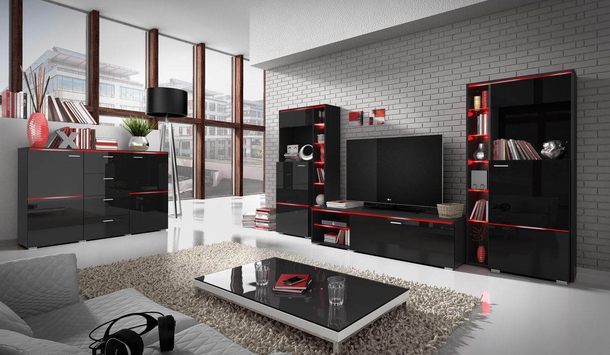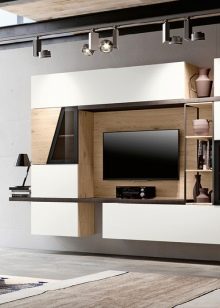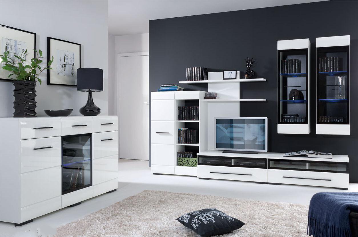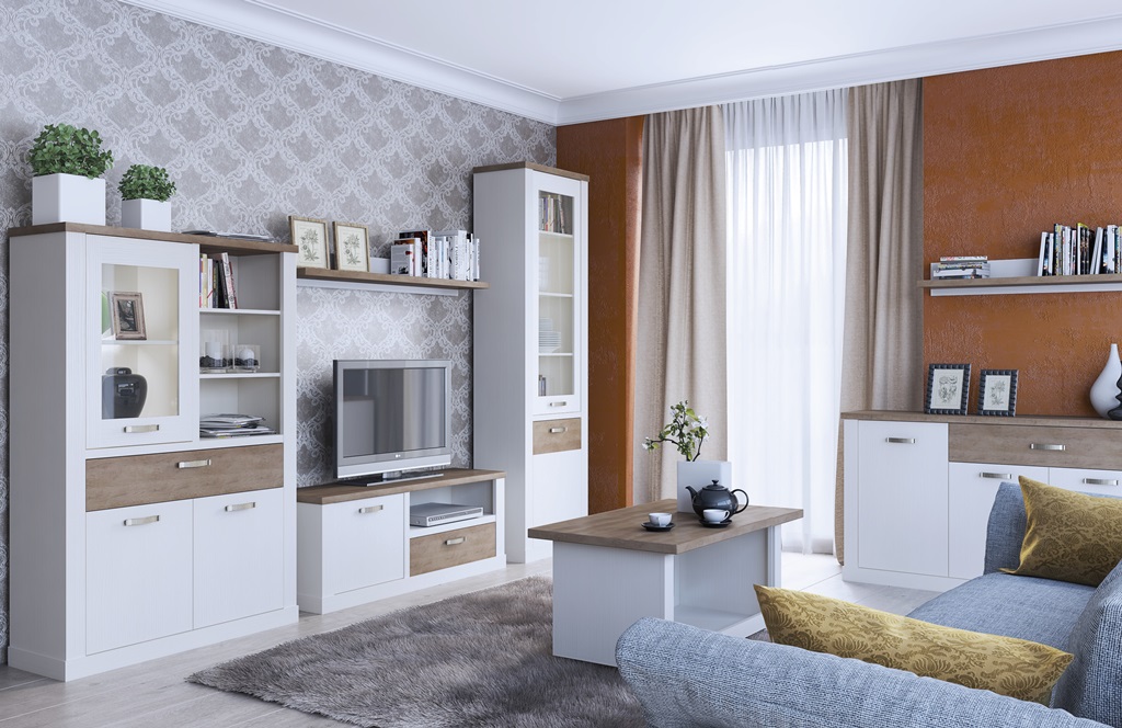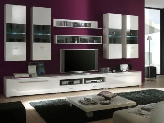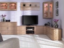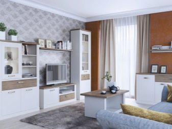 Das gesamte Set sollte im gleichen Stil und aus dem gleichen Material hergestellt werden. Wir sollten die Harmonie des modularen Sets und des gesamten Raumes nicht vergessen. Das Wohnzimmer ist ohne Polstermöbel undenkbar. Polsterfarben können mit der Farbe der Möbel kombiniert werden und als kontrastierender Akzent wirken. Ihre Rolle ist es, eine gemütliche und gemütliche Atmosphäre zu schaffen. Neben Eckschränken, stellen und verschiedene Konfigurationen von Schränken.