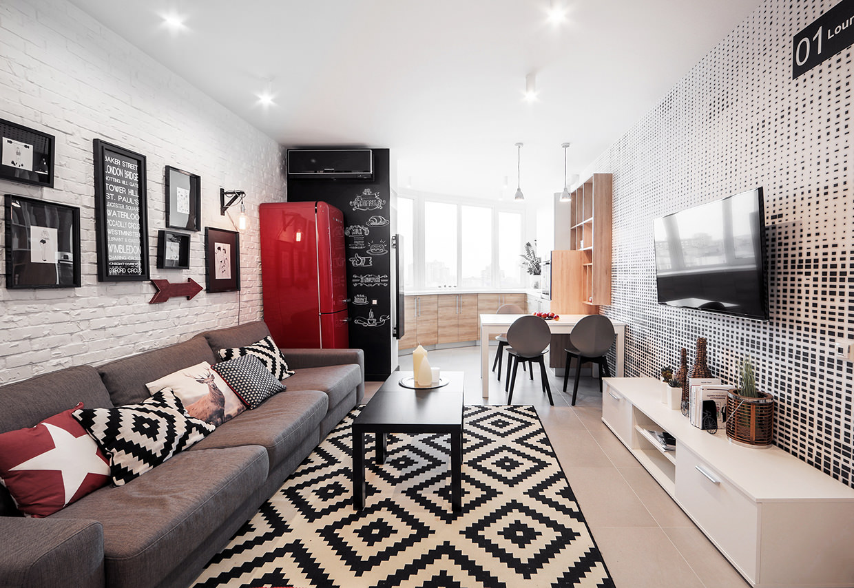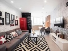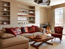 - Nicht-Standard-Wohnzimmer ist voll mit Designer-Ideen. Sie können leicht die mutigsten Entscheidungen verkörpern und verschiedene Stile anwenden.