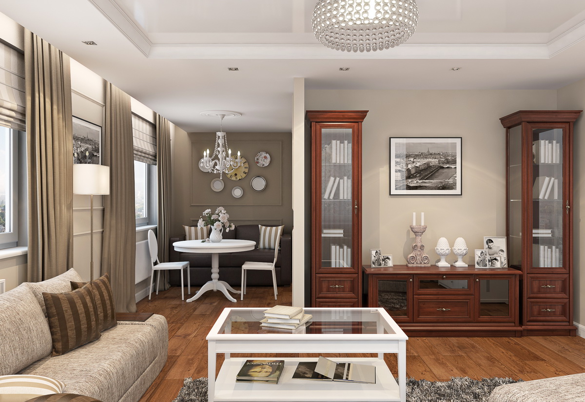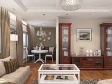 Der traditionelle Stil ist vielen bekannt.Dieser Stil wird nie aus der Mode kommen und nicht alt werden. Nur die Alterung von Objekten ist möglich. Dieser Innenraum ist durch die Anwesenheit von Wänden, Schränke, Kommode, Vitrinen für Geschirr, Esszimmer Gruppe gekennzeichnet. Und ein weiteres sehr wichtiges Element - die Anwesenheit eines Sofas und zwei Stühle. Solche Wohnzimmer waren vorher, und auch jetzt werden sie oft gefunden.