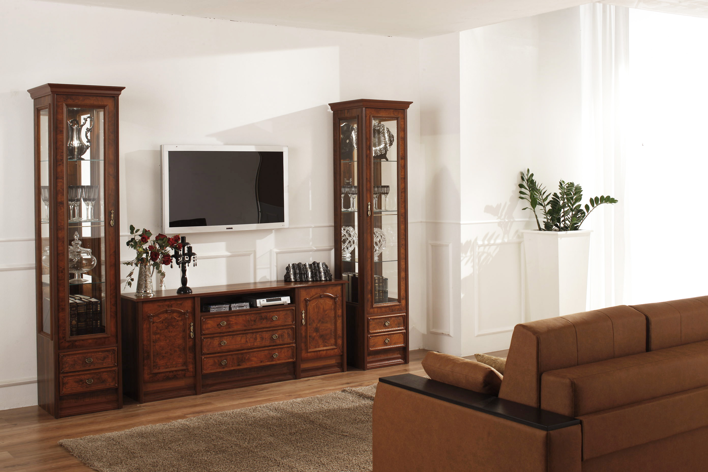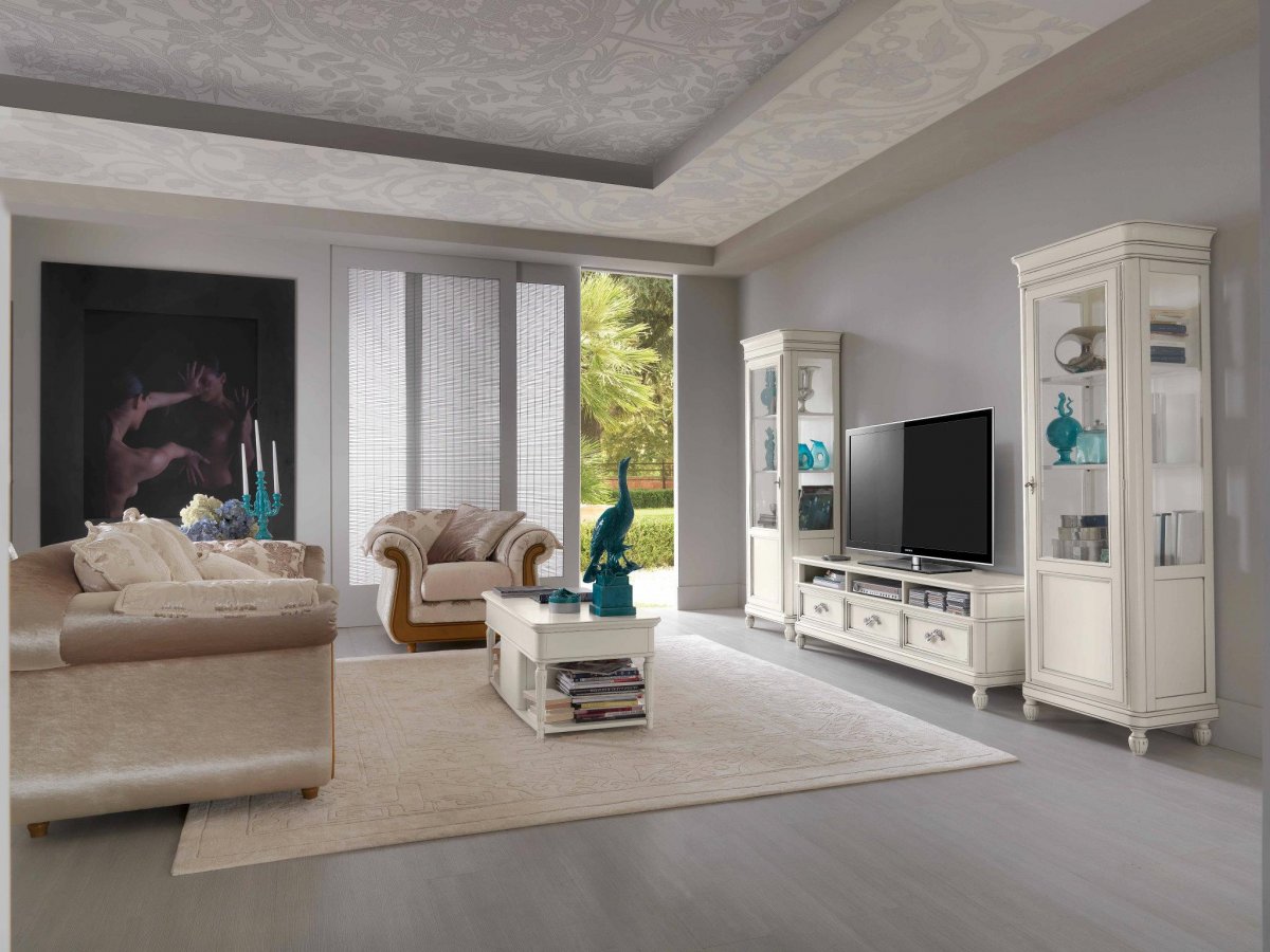 Die Möbel im klassischen Stil enthalten einige Merkmale des strengen Klassizismus, der Feierlichkeit des Empire-Stils und der Sanftheit des Rokoko, Barock. Unterscheidungsmerkmale sind glatte Linien, Verfeinerung eines Dekors. Solche Möbel sehen in riesigen Hallen mit hohen Decken und Parkettböden gut aus. Er wird zu Recht königlich genannt. Für die Herstellung von Möbeln mit teuren Baumarten. Für Polsterschwimmbronze, Gold, elegantes Gewebe. Solche Möbel können in der weißen Farbe in Kombination mit Gold gemacht werden.So können Sie den Eindruck von Reinheit, Luxus und Vollständigkeit erzeugen. Das Hauptthema im Wohnzimmer mit solchen Möbeln ist ein Kamin. Eine Reihe von klassischen Stil besteht aus Polstermöbeln, einem Holztisch in verschiedenen Formen, weichen geschnitzten Stühlen, einem Couchtisch.