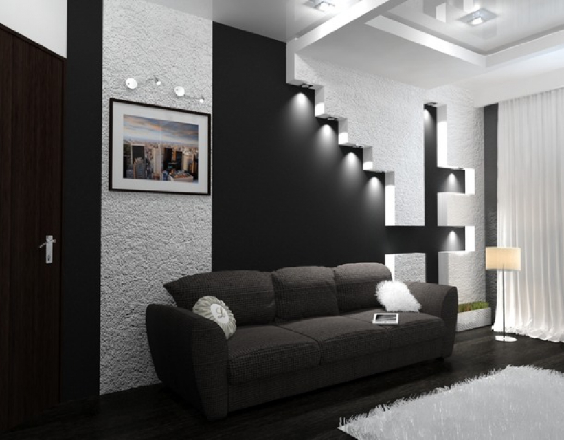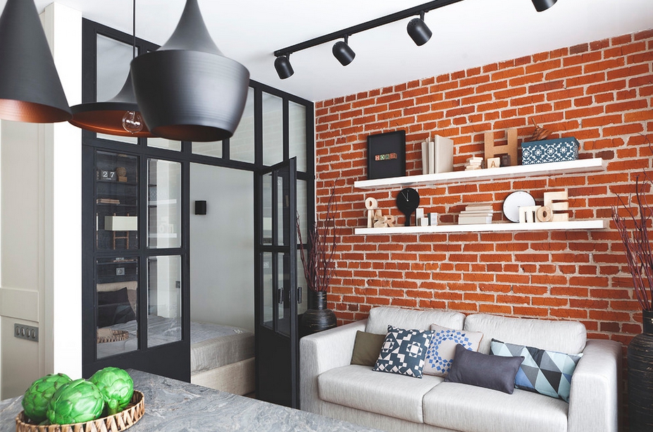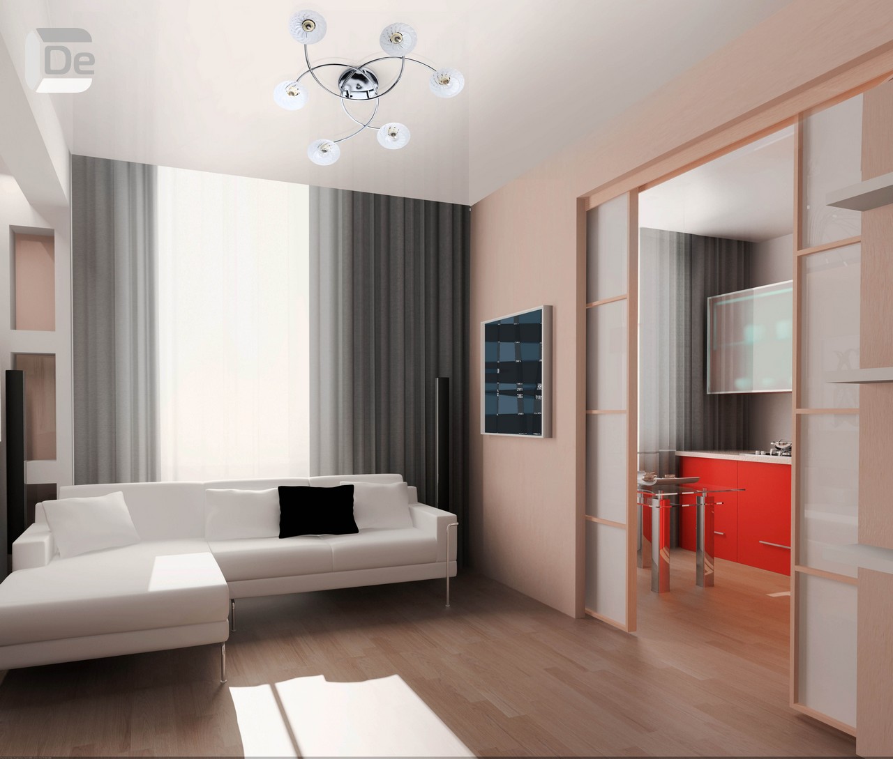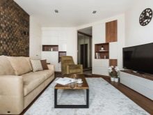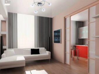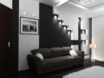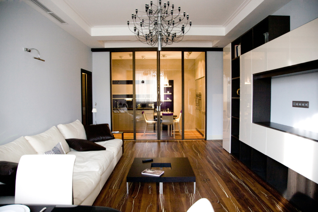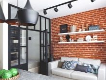 Für die Trennung von Zonen verwenden oft ein Laminat aus dunklen und hellen Farben, einfache Möbel, sowie Glastrennwände, die nicht zu viel Platz einnehmen. Der letzte Schliff wird die Dekoration von Metallteilen sein.