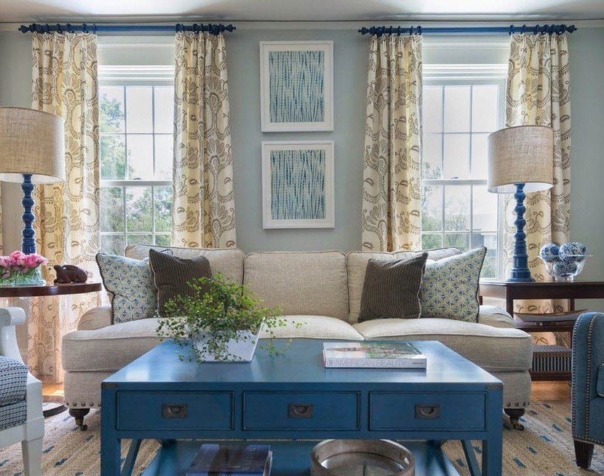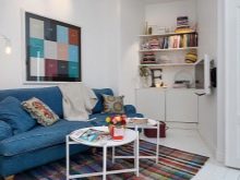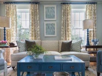 Wohnzimmer, in blau dekoriert, wird dazu beitragen, das gegenteilige Ergebnis zu erzielen. Eine andere Option ist ein achromatisches Farbschema, wenn das Gästezimmer in verschiedenen Farbtönen derselben Farbe gestaltet ist.