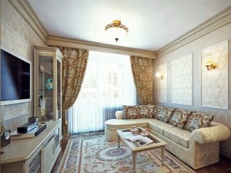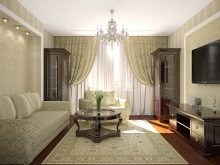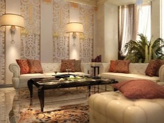 Beim Einrichten des Wohnzimmers müssen Sie auf die Farben der Wände und des Bodens achten. Farben sollten Pastell sein, und Möbel im Gegenteil, dunkel oder schwarz. Die Tapete kann glatt oder textil sein. Die Möbel sind besser in der Mitte platziert, während sie luxuriös aussehen sollten. Der Zusatz wird ein massiver Kronleuchter sein, sowie Bronzelampen.