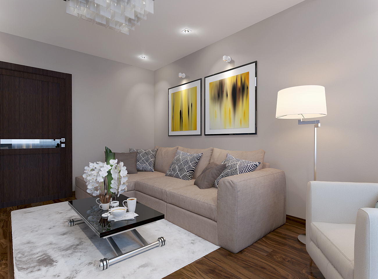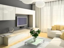 Für Wohnzimmer Design 17 qm. m kann eine Vielzahl von Farben verwenden. Zum Beispiel solche hellen Farben wie Weiß, Creme, Beige, Aprikose, Sand. Sie werden Ihr Zimmer optisch erweitern. Aber die dunklen Farben empfehlen Designer in solchen Bereichen zu meiden. Es reduziert den Raum und ist in Depression eingetaucht.
