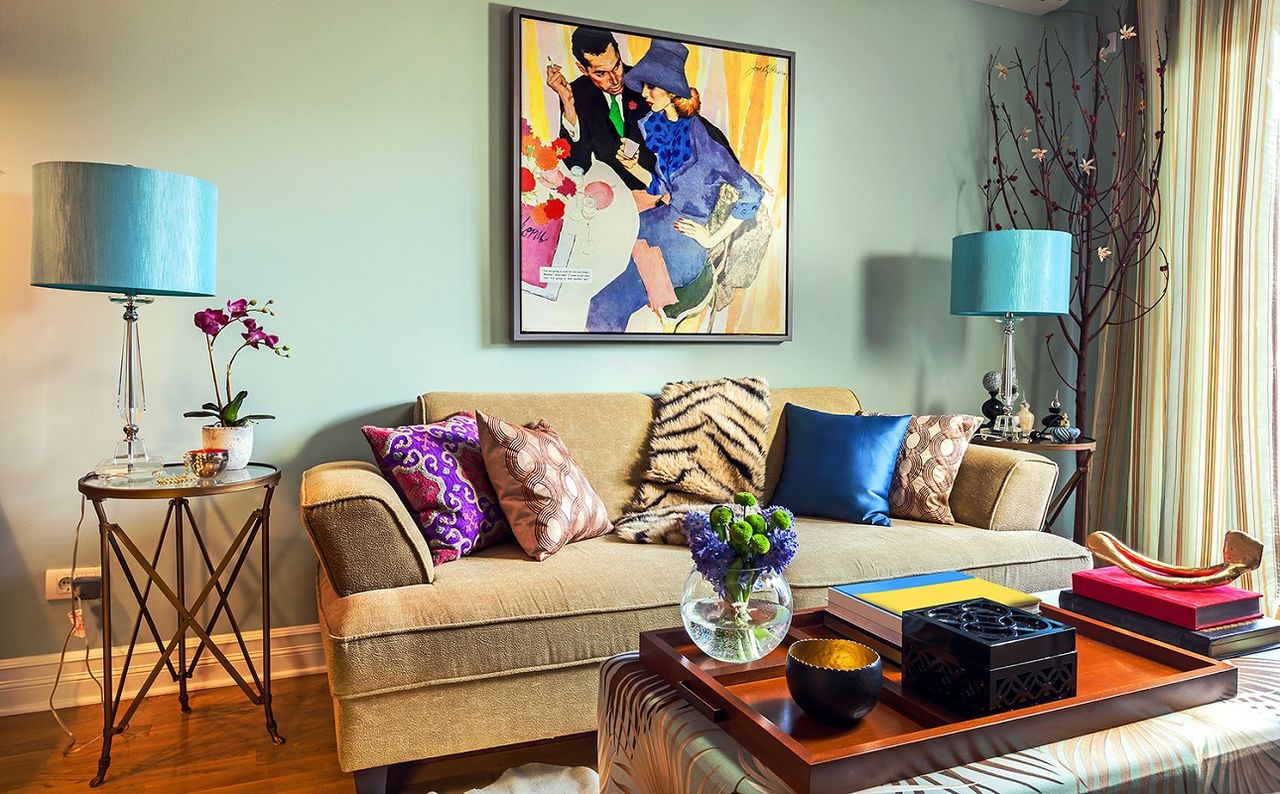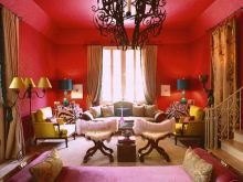 Indem Sie mehrere Stile in einem kombinieren, können Sie sowohl ungewöhnliche Schönheit als auch geschmackloses Interieur schaffen. Dieser Stil kombiniert bunte Tapeten, bunte Teppiche, teure Vasen.