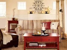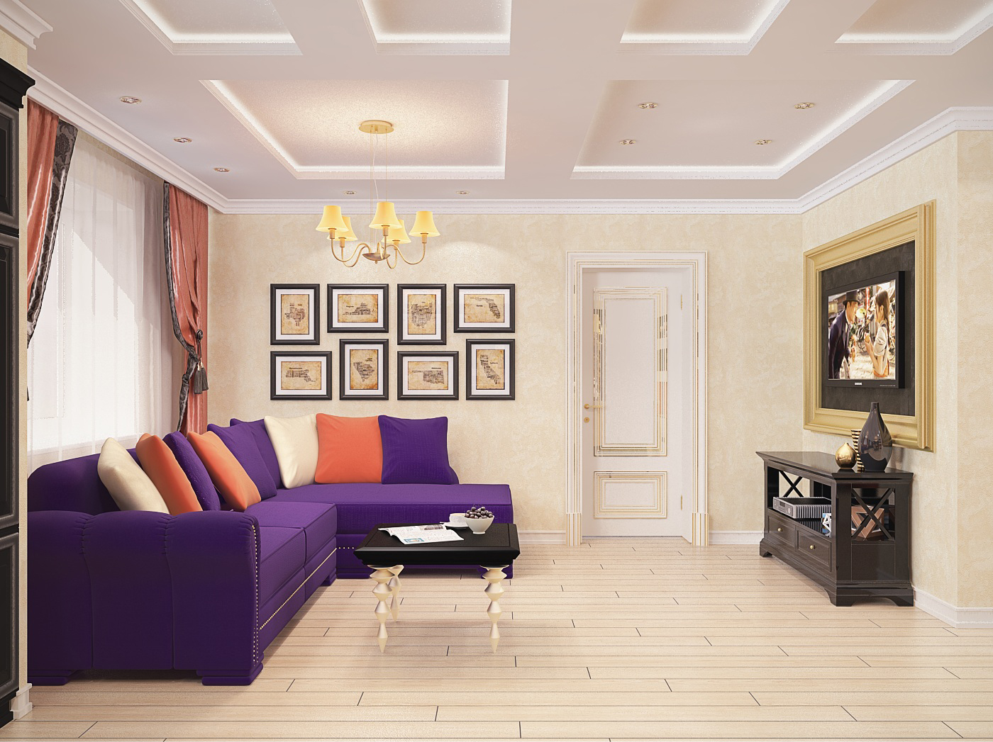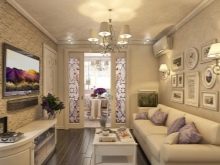 Dieser Stil kam von der französischen Provinz zu uns. So können Sie selbst in einem kleinen Wohnzimmer in einem Plattenhaus eine unbeschreibliche Atmosphäre der Provence schaffen. Wählen Sie dazu einfach die Details aus, die zum Stil passen: Töpfe mit leuchtenden Farben, Weidenkörbe, bemalte Teller oder Familienfotos in Rahmen. All dies wird dazu beitragen, Ihr Wohnzimmer zu "beleben" und es komfortabler zu machen.