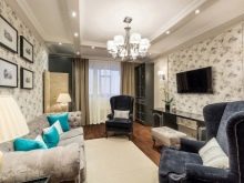 Die Möbel sind aufeinander abgestimmt: Sofas, mit Seide gepolstert, Boden aus Edelholz, Kristallkronleuchter. Ein Kamin aus Marmor wird im Wohnzimmer im klassischen Stil sehr schön aussehen. Auf dem Regal können Sie vergoldete Kerzenständer platzieren. Die Decke sollte hell sein, um die Höhe der Wände optisch zu erhöhen.