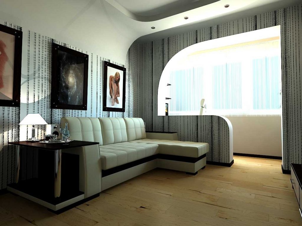 Kombiniert man die Loggia mit dem Wohnzimmer, entsteht ein Schlafplatz. Es kann durch Kunstglas getrennt werden, das nicht nur versteckt, sondern auch den Schlafbereich optisch erweitert. Diese Option wird dazu beitragen, einen Arbeitsbereich mit einem Computer zu erstellen. Hier wird es bequem sein, die Regale mit Büchern und verschiedenem Zubehör zu platzieren.