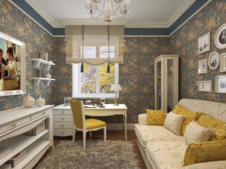 Die Wände in einem solchen Wohnzimmer sind besser mit Tapeten in hellen Farben mit Blumenmuster oder mit Holzpaneelen gepolstert. Der Boden muss mit Holzbrettern oder Fliesen verkleidet sein, die künstlich so getragen werden, als ob sie seit Jahrzehnten verwendet würden.