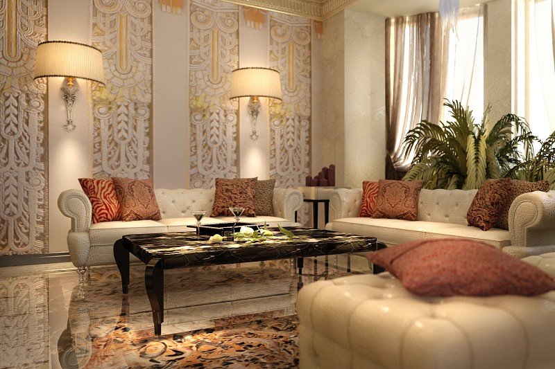 Das Wohnzimmer im Art Deco Stil wird am häufigsten in den Häusern von Schauspielern und Künstlern gesehen.In diesem Stil verbinden sich archaische und ägyptische Motive, deren Kunst vor allem von kreativen Menschen bewundert werden kann.