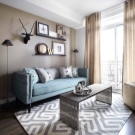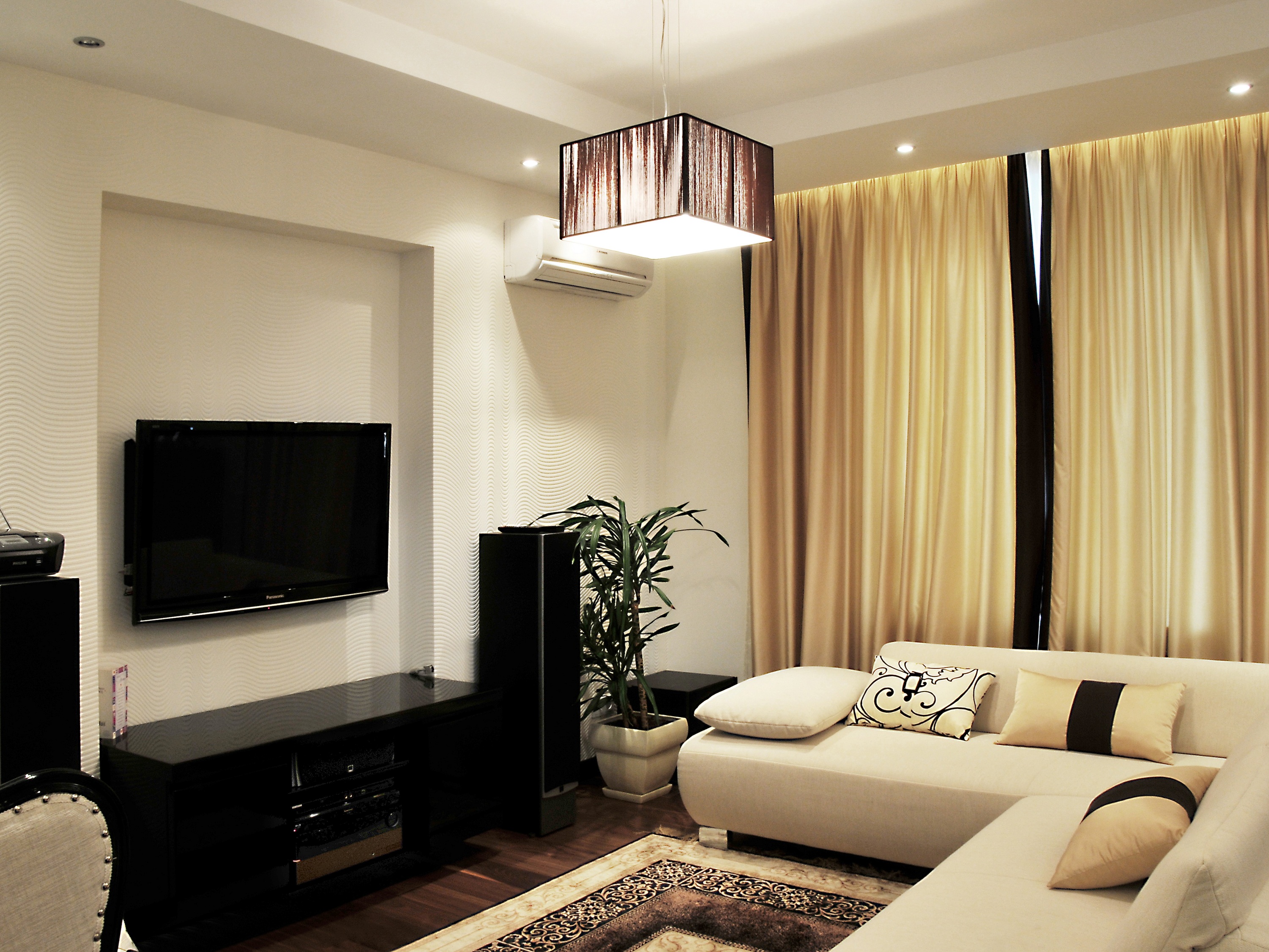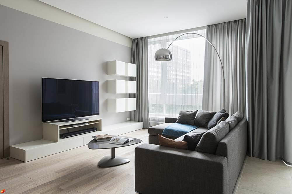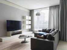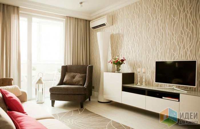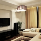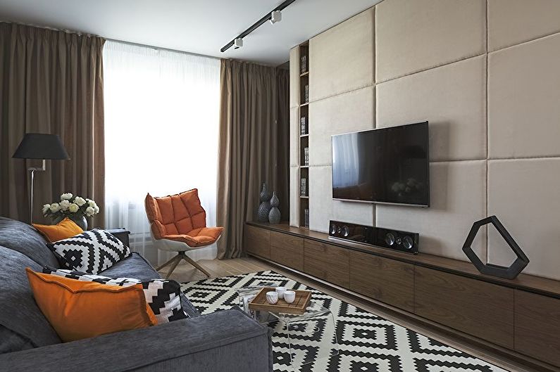 Vor dir - ein subtiles Spiel von hellen und dunklen Tönen. Die durch das Fenster strömenden Lichtstrahlen brechen abrupt an den Grenzen der Vorhänge ab, schwarze und weiße Farben finden sich in den Mustern des Bodenbelags und der Kissen. Separate Kissen und ein Sessel spielen die Rolle von Farbakzenten, mit einem schwarzen Fernseher auf einer leicht beigen Wand. Darunter befindet sich das Aufbewahrungssystem aus Edelholz.