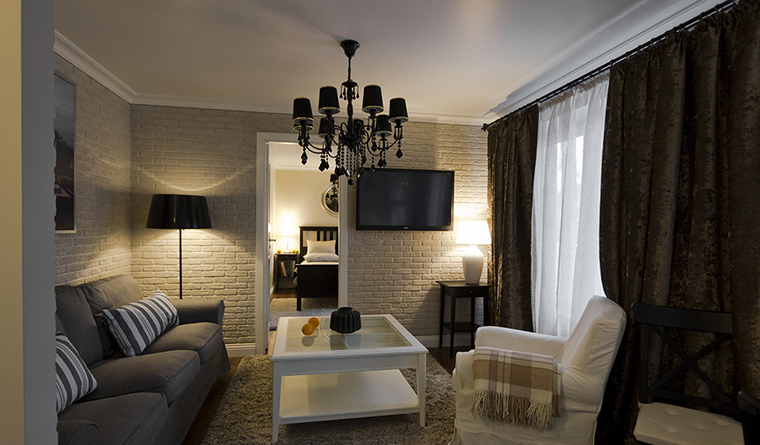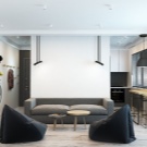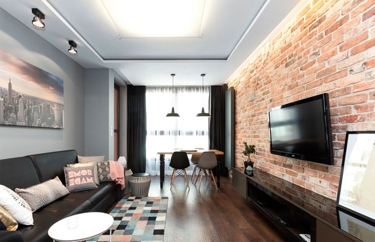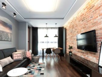 Sofort waren die Konzeptentwickler dem Loft gegenüber loyal. Eine schwarz verglaste Trennwand mit einer Tür führt zum nächsten Raum. Die Farbe mit ihr harmoniert sowohl mit dem Lampenschirm der Hauptlampe als auch mit der Gruppe der Hilfsdeckenlampen.Die Ziegelmauer, auf der ein paar nicht zu breite Regale befestigt waren, ist fast über die gesamte Länge mit einem kontrastierenden weißen Sofa besetzt.