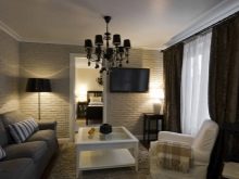 Undenkbare Klassiker ohne Stuck, ohne Dachgesims. Setzen Sie mindestens einen Bogen oder eine Säule, um die Vollständigkeit des Innenraums zu betonen, und bedecken Sie die Fenster mit schweren Vorhängen mit einem vertikalen Fall. Nehmen Sie die Gurte vorsichtig auf, so dass sie nicht zu groß und rau sind.