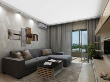 Die meisten Oberflächen in diesem Wohnzimmer sind ziemlich hell, vor allem in der Decke, wo eine Kette von Leuchten verwendet wird. Eine der Wände ist in einem hellen, burgunderroten Farbton gehalten und harmoniert mit dieser Farbe der Kissen, die auf einem grauen Ecksofa ausgelegt sind.Ein Fernseher ist an der Akzentwand installiert, und ein weißer, länglicher Stand grenzt ohne Übergang an den unteren Teil. Der Teppich auf dem Boden und mehrere Blumen in Vasen an verschiedenen Stellen helfen, die Atmosphäre angenehmer zu machen.