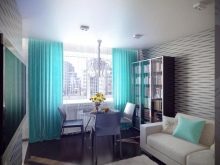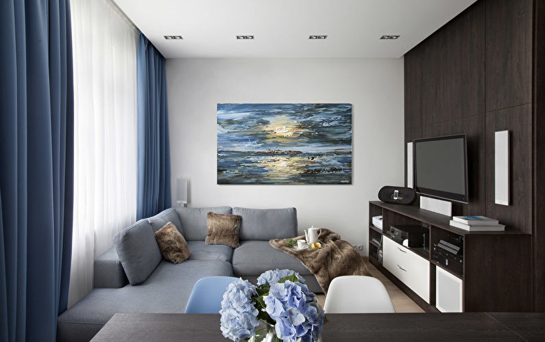 Und hier kombinierten sie blaue, schwarze und weiße Töne in einer Komposition. Das Bild mit der Meereslandschaft betont harmonisch die Farbe der Vorhänge. Verdünnte Versionen der gleichen Farbe zeigt uns eine Blume, einen Stuhl auf dem Tisch. Das graue Sofa wird durch einen eleganten dunklen Kleiderschrank mit Spiegeln und weißen Elementen an der Fassade ersetzt.