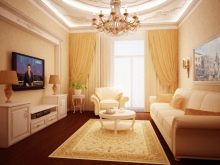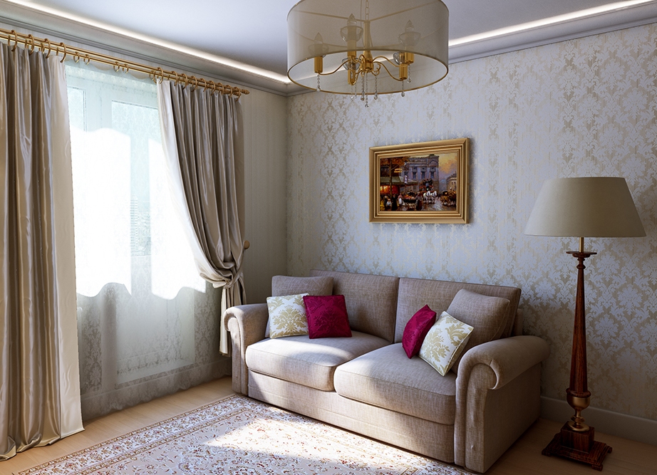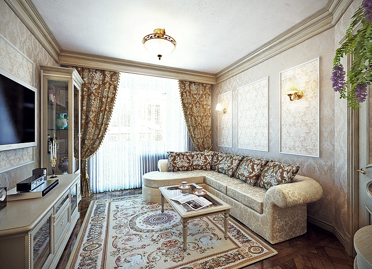Wenn die Gesamtfläche des Wohnzimmers 12 und 15 m² beträgt, reicht es bereits für die Fertigstellung aus im klassischen Stil. Eine solche Lösung bedeutet die Symmetrie der gesamten Situation, Harmonie und Leichtigkeit. Keine energetischen Einschlüsse sollten nicht sein, aber Sie können es sich leisten, mehr weiße Töne zu verwenden, Kristalllampen und vergoldete Spiegel zu verwenden.