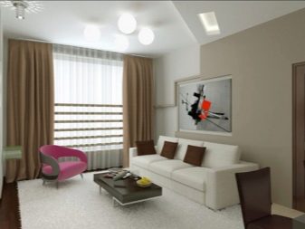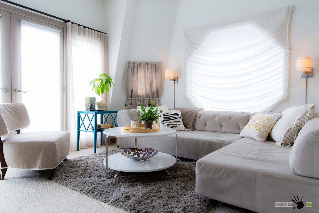 Achten Sie bei der Auswahl der Stoffe darauf, sie mit dem Stil des Interieurs zu kombinieren. Seide, Satin und Samt Texturen passen in die klassische Umgebung, weiße durchscheinende Materie im Loft, feine Blumenmuster im Land.Leichter Stoff mit einem brillanten Effekt funktioniert perfekt auf der äußeren Ausdehnung des Territoriums. Vorhänge werden mit anderen Ordnungen kombiniert. Sie können entweder die Farbe der Wände wiederholen und sich auf eine ähnliche Farbe konzentrieren.