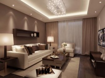 Platz Wohnzimmer können mit Möbeln jeglicher Art direkt von den Wänden oder in der Mitte eingerichtet werden. Wenn Winkelentscheidungen angewendet werden sollen, ist es einfach, eine Komposition in Form einer Raute zu erstellen. In einem rechteckigen Raum ist die Verwendung von Möbeln mit hoher Rückenlehne. Wenn Sie eine banalere Lösung wählen, werden Sie ein Gefühl von Unbestimmtheit spüren und die Situation verwischen.