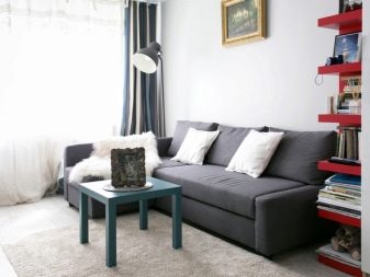 Alternativ können Sie das Ecksofa benutzen. Es nimmt weniger Platz in Anspruch als sein Pendant in voller Länge, aber in praktischer Hinsicht in nichts nach. Das Erholungsgebiet ist meist mit dem Essbereich verbunden, und bei akutem Platzmangel gibt es auch eine zusammenklappbare Schlafecke.