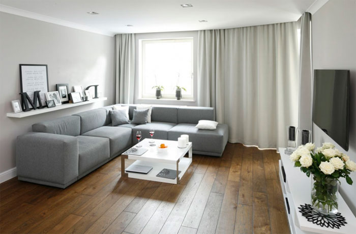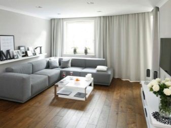 Um die visuelle Größe des Raumes zu vergrößern, können Sie nicht nur helle, sondern auch neutrale Töne anwenden, aber nicht mehr als drei gleichzeitig. Dunkle Flecken sind ebenfalls erlaubt, aber sie sollten in den Ton des Bodens, in die Farben der Möbel und in die dekorativen Elemente eingegeben werden.