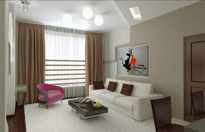 Durch die konsequente Fortbewegung entlang dieser "Kette" wird es sehr einfach und einfach sein, ein optimales Innenraumkonzept zu schaffen, das den strengsten Kritikern gerecht wird. Erst danach macht es Sinn, an den funktionalen Eigenschaften des Raumes zu arbeiten und schließlich zu Zubehörteilen und Attributen überzugehen, die eine bestimmte Idee betonen. In den meisten Fällen ist es notwendig, verschiedene Funktionsbereiche zu kombinieren, sie räumlich zu unterteilen und die visuell definierten Bereiche zu trennen.