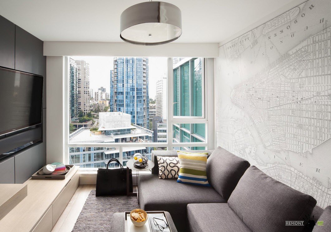 In einer kleinen Wohnung empfiehlt es sich, Tapeten in verschiedenen Farbtönen zu kombinieren, aber die Hauptfarbe sollte relativ dunkel sein, und der Akzent sollte am hellsten sein.Wenn Sie wissen, dass das Abschlussmaterial mit den Klauen von Haustieren in Kontakt kommt, ist eine geprägte Tapete, die mit zufällig aufgetragenen kleinen Mustern bedeckt ist, vorzuziehen. Diese Lösung maskiert die unvermeidlich auftretenden Defekte. Wenn das Ziel ist, die Decke zu heben, lohnt es sich, die Wände mit Material zu bedecken, das vertikale Streifen hat.