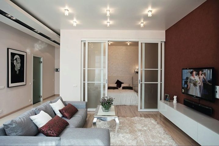 Für die Zonierung sind weit verbreitet Spiel von Licht und Schatten, Möbel, die Kombination von Farben und Materialien.
