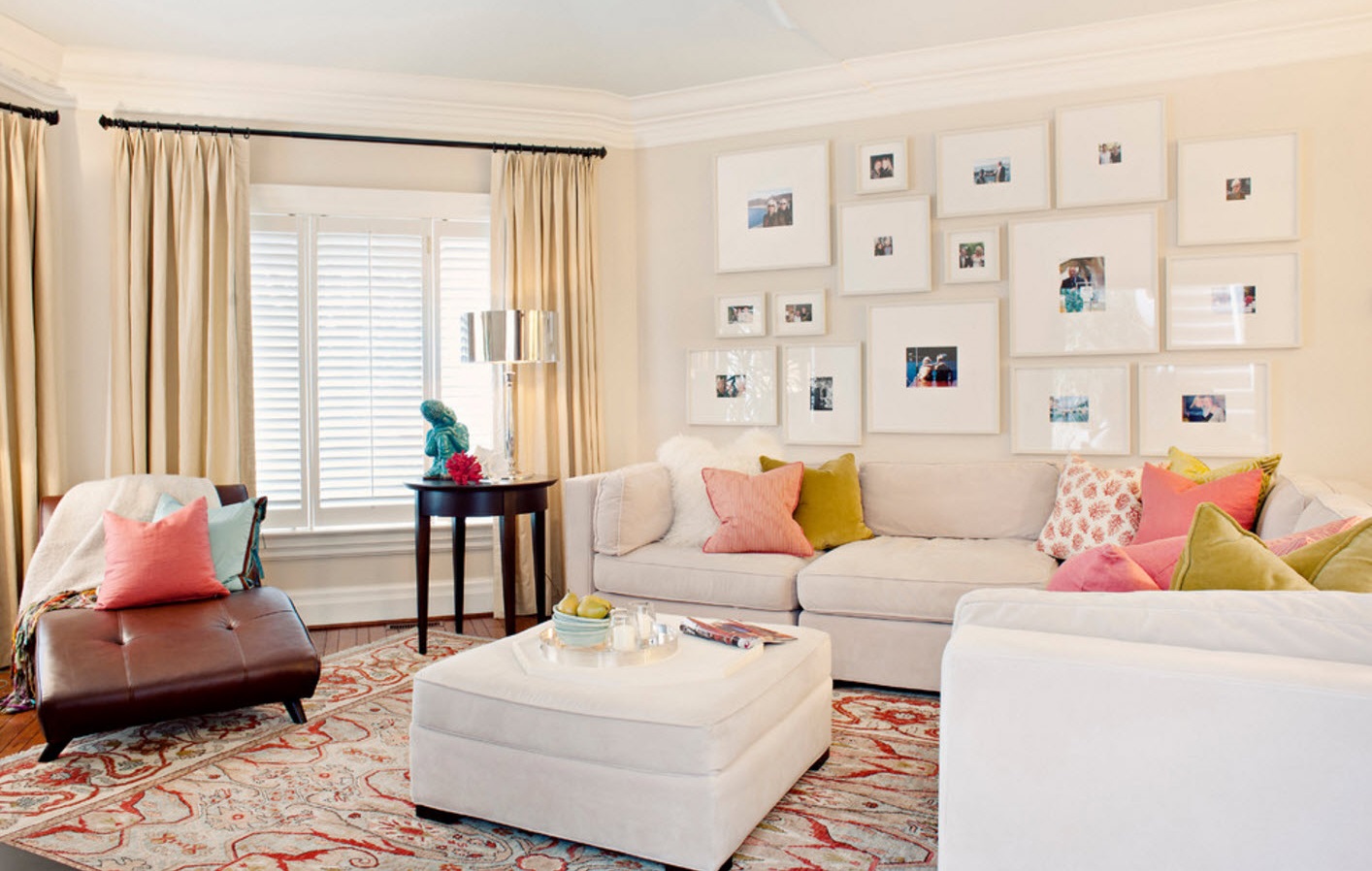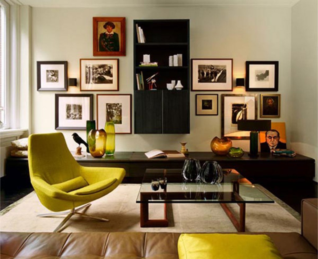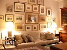 Ein gutes Beispiel für die Gestaltung von persönlichen Fotos mit Hilfe von weißen voluminösen Matte im Wohnzimmer.