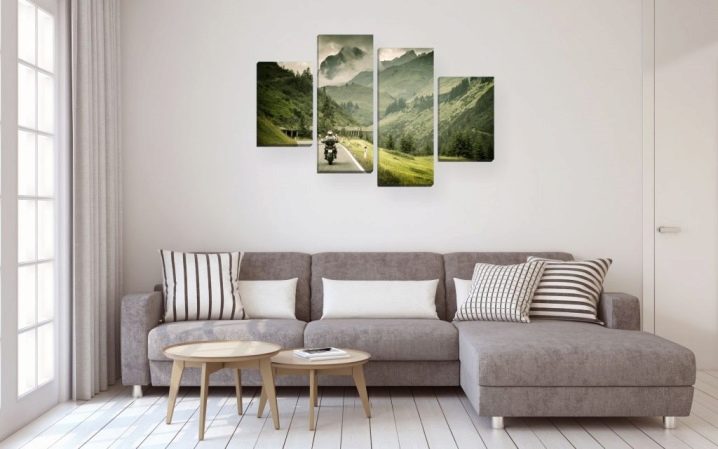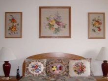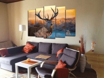 Leinwände mit Landschaften oder Motivbildern, Porträts passen organisch ins Wohnzimmer. Die Küche ist perfekt mit Stillleben, Bildern von Blumen, Naturlandschaften und Tieren kombiniert. Das Schlafzimmer ist ein Ort der Ruhe, so dass es sich lohnt, einfache Szenen dafür zu wählen, schwarz-weiß Fotos in einer Matte und einem einfachen Rahmen gerahmt, und das Bild ist am Kopfende des Bettes platziert.