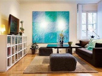 - Helle und autarke Räume erfordern keine zusätzlichen Akzente, und dann muss die Malerei im bestehenden Innenraum aufgelöst werden, dazu ist es wichtig, das Farbschema des ganzen Raumes zu beachten.