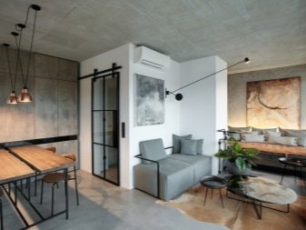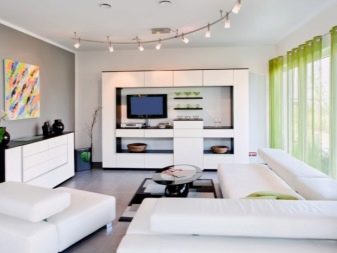 - Hightech - Stil, der die Vorteile der modernen Technologie aufnahm. Es verfügt über die funktionellsten und eingebauten Möbel, die normalerweise in einer Reihe von Wandoberflächen gelöst werden. Kunstobjekte, Gemälde mit einer geometrischen Handlung und Abstraktionen werden hier angebracht sein.