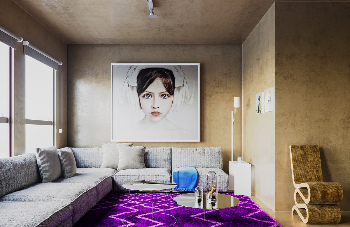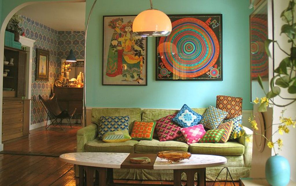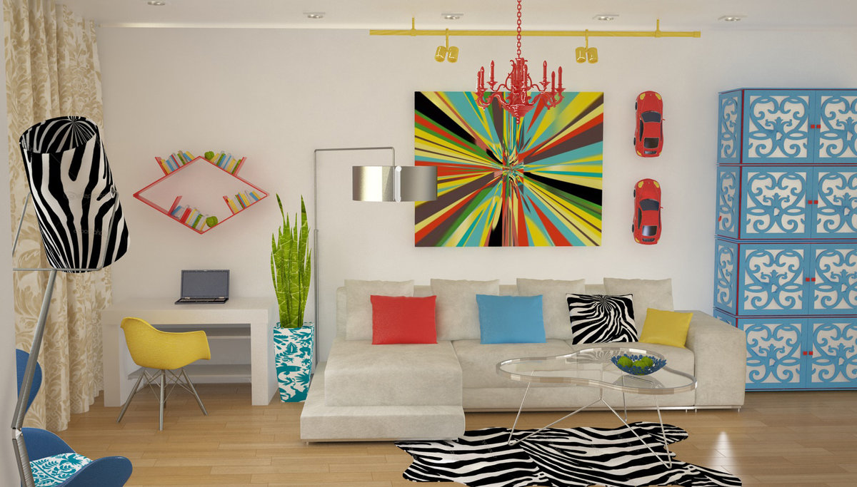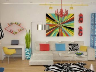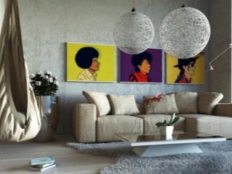 - Pop-Art - glänzend glänzende Oberflächen, helle Farben in der Dekoration der Wände, das Vorherrschen von Plastikmöbeln. Es ist notwendig, ein solches Interieur mit Plakaten mit Bildern von Comic-Büchern und berühmten Persönlichkeiten oder einer grafischen Tafel zu dekorieren.