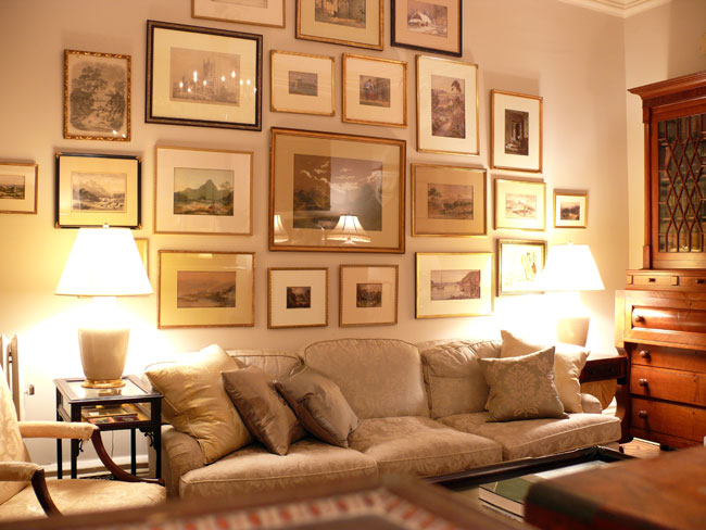 - Niedrige Decke erhöht die vertikal gestreckte Leinwand. Der schmale Raum erweitert optisch die aufgereihten Bilder mittlerer oder kleiner Größe.