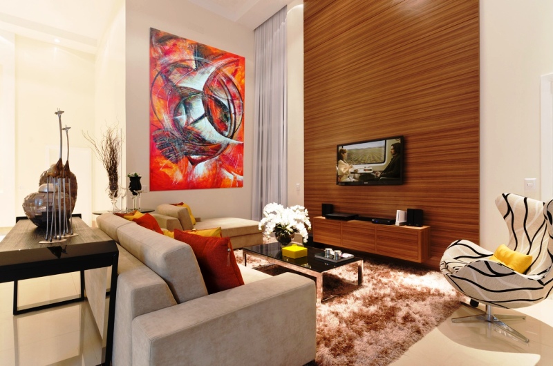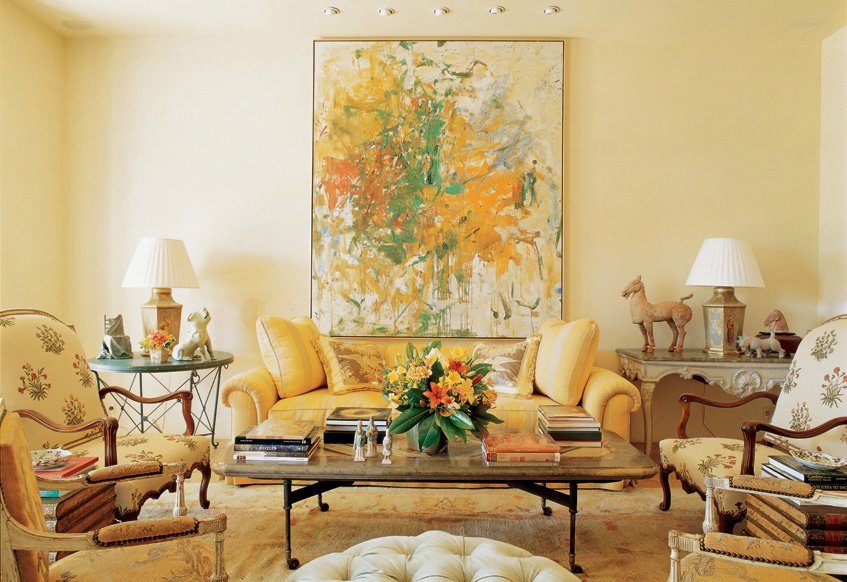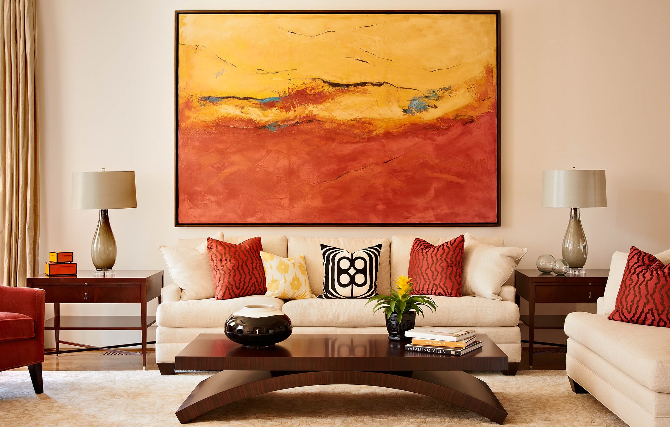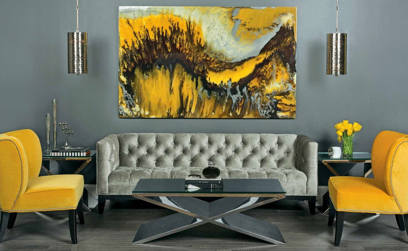 Das Wohnzimmer in einer beigen Palette kombiniert perfekt mit Leinwand, die Abstraktion darstellt, mit Ocker- und Gelbtönen, die mit Kissen auf der Couch und dem Stuhl mitschwingen.