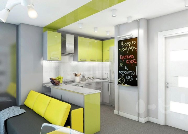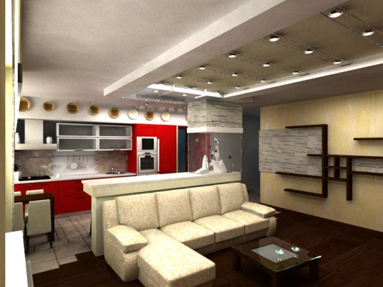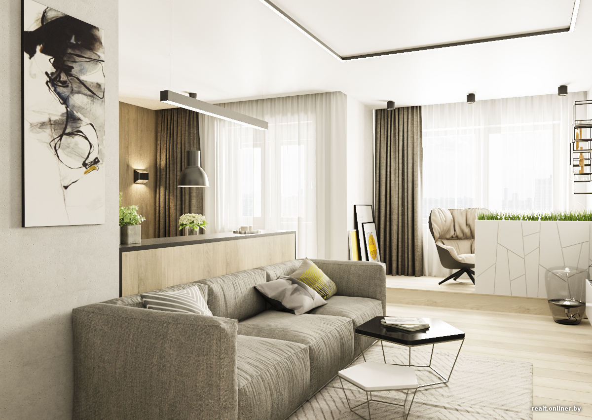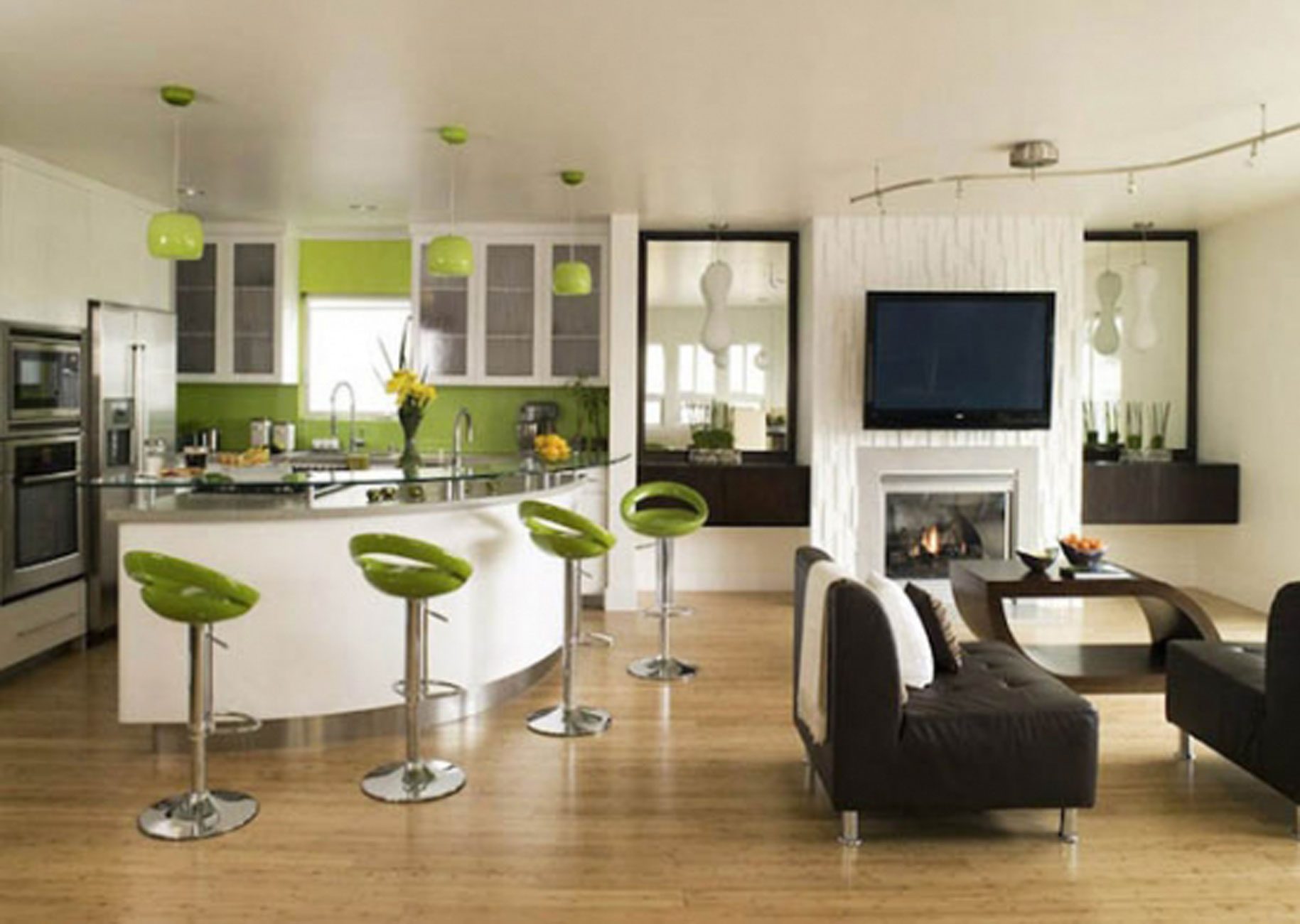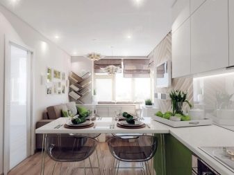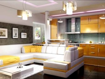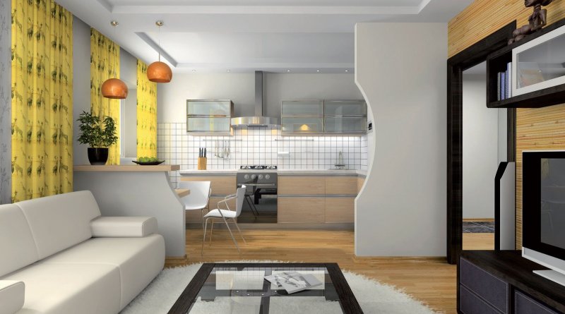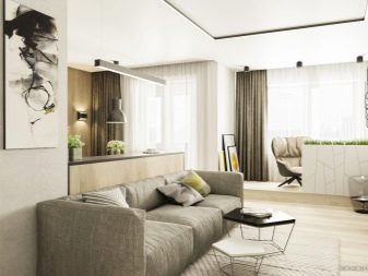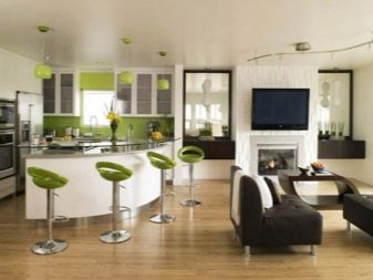 Um den Raum in der Küche-Wohnzimmer zu teilen, können Sie verschiedene Böden und Bar Theke verwenden,die in der Mitte des Raumes stehen und auf dem Sofa enden. Die Farbe dieser Elemente sollte kombiniert werden und nahe sein. In diesem Fall ist das Polstersofa aus milchigem Stoff mit einem zarten hellbeige Print. Der Bartresen hat einen hellen Pistazienschirm und die horizontale Fläche besteht aus weißen Fliesen.