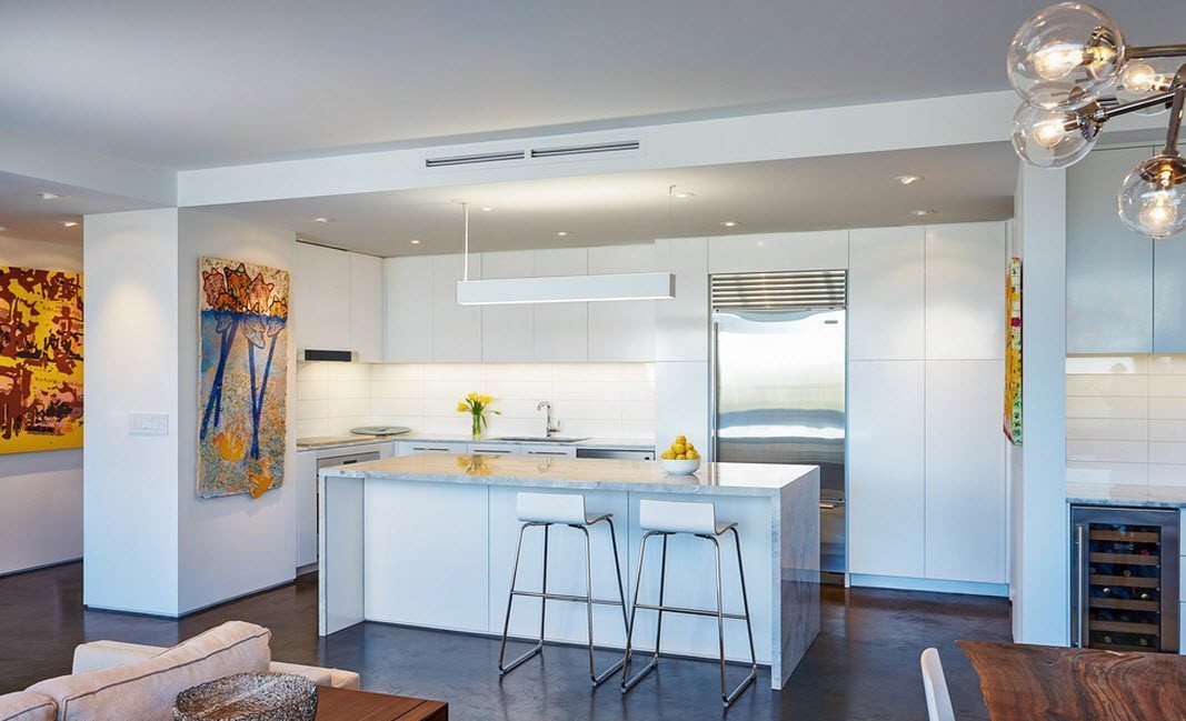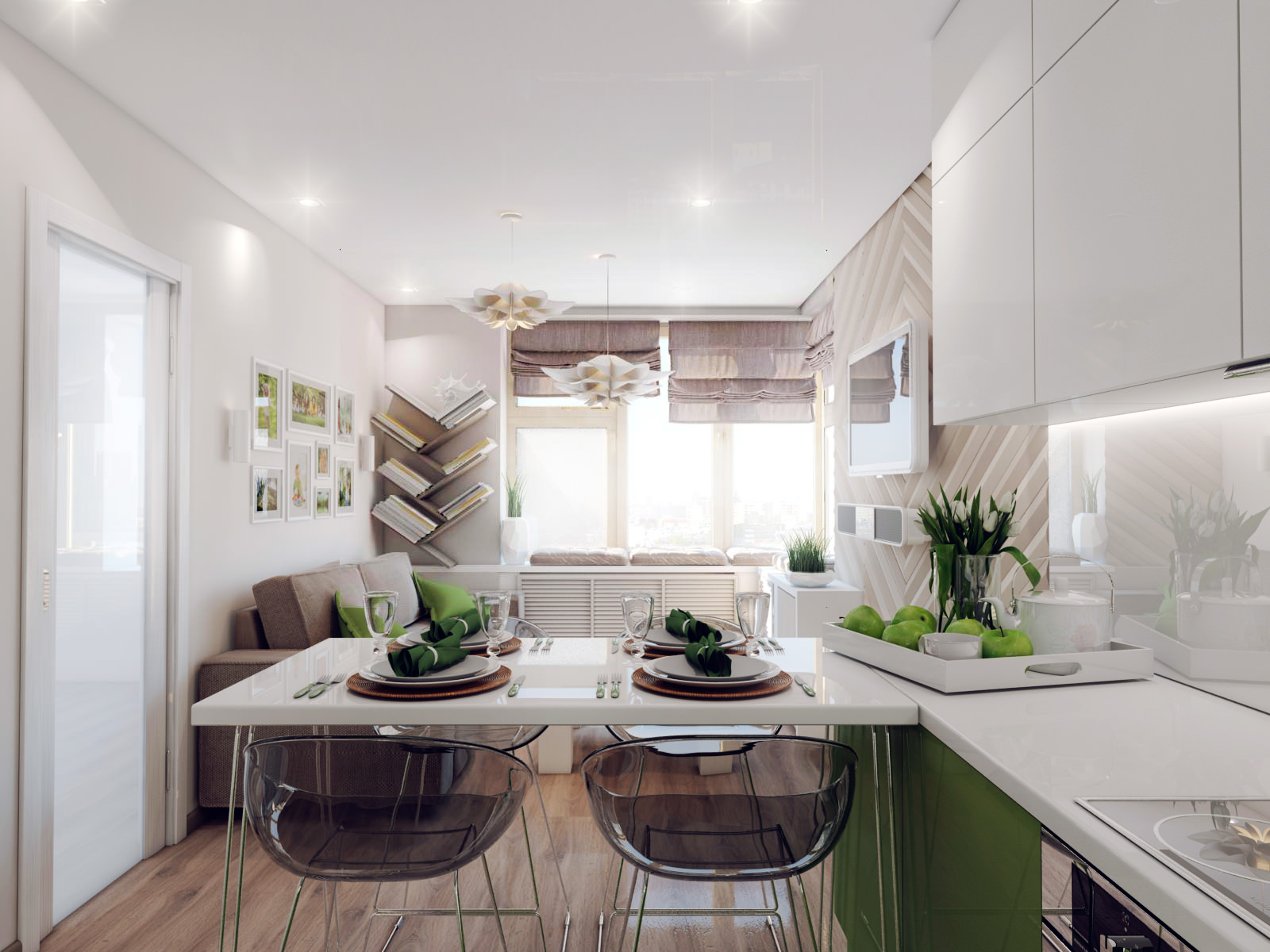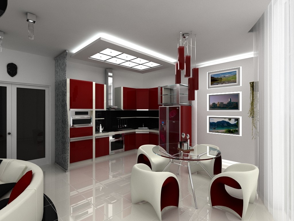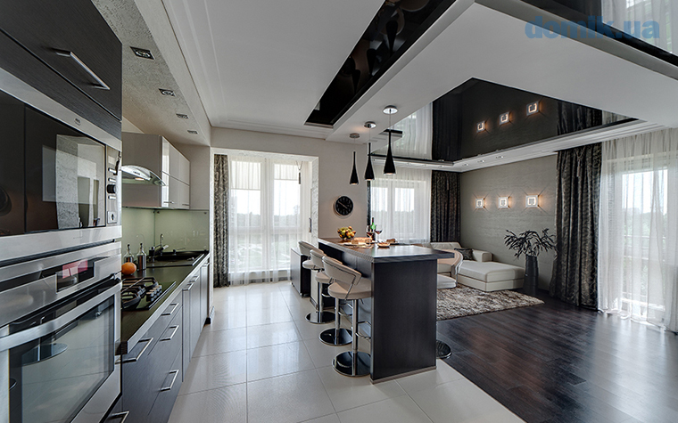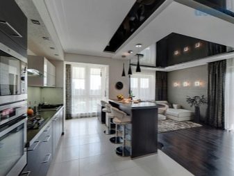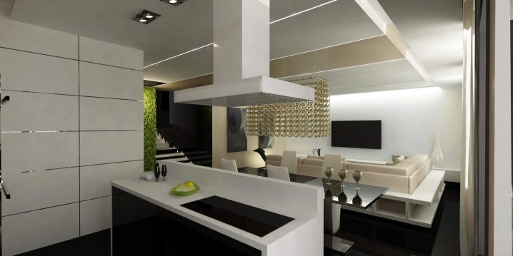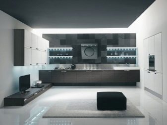 Eine Küche ist solch ein besonderer Raum in einer Wohnung, wo Sie alle Lieben sammeln können, eine warme Unterhaltung mit ihnen haben und Sie köstlich speisen können. Das Design dieses Raumes kann sehr unterschiedlich sein, alles hängt von Ihren Geschmackspräferenzen und Ihrem Budget ab. Die ehrgeizigsten und ungewöhnlichsten Ideen können sowohl in einem großen Bereich als auch in einem kleinen Raum verkörpert werden. Ein Wohnzimmer kann leicht zum organischen Teil einer solchen Küche werden. Das Interieur im Hightech-Stil ist in diesem Fall perfekt und erfordert keine großen Investitionen, Zeit und Mühe.