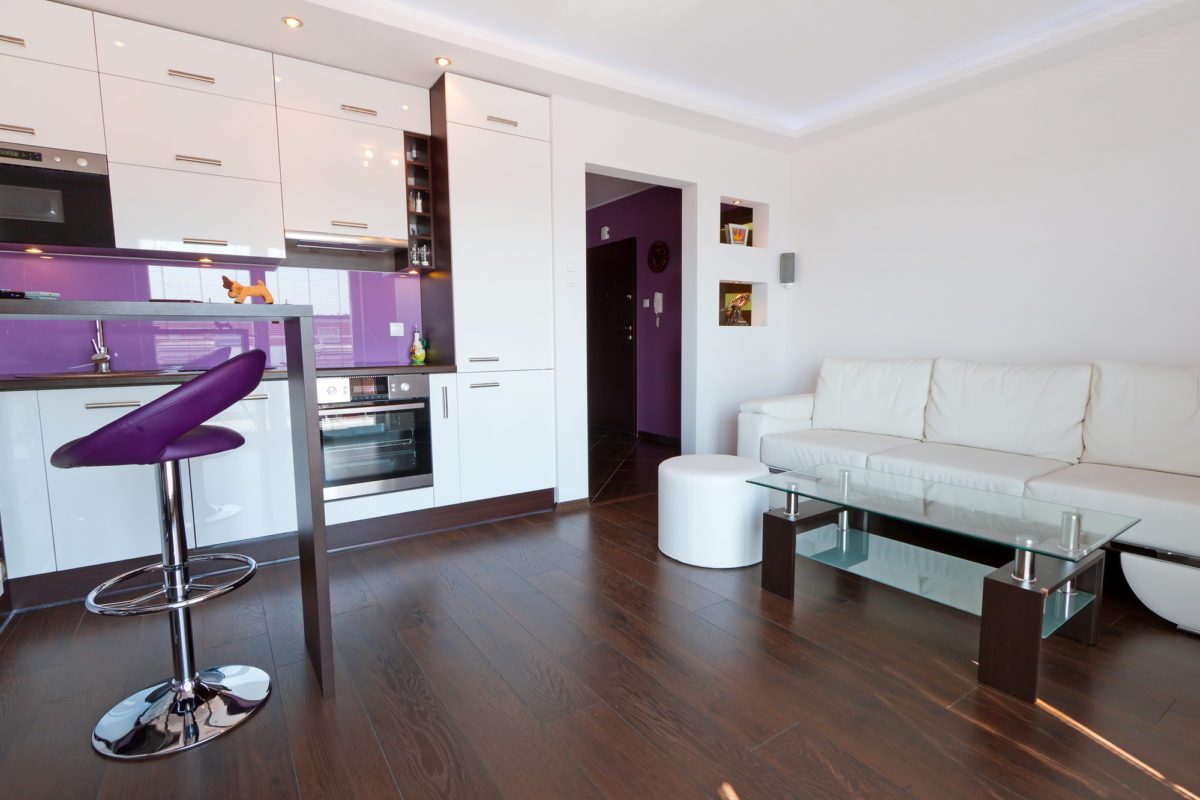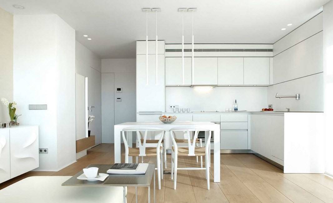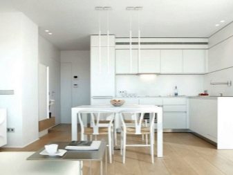 Im Wohnzimmerteil befindet sich dunkelbraunes Parkett, das von der Küche aus leicht in weißgraue Fliesen verwandelt wird. Der Esstisch in Farbe ist mit Parkett kombiniert, und gepolsterte Stühle mit hohen Rückseiten - mit Fliesen. Weiße Farbe kann auch für Einbauschränke und Haushaltsgeräte verwendet werden.