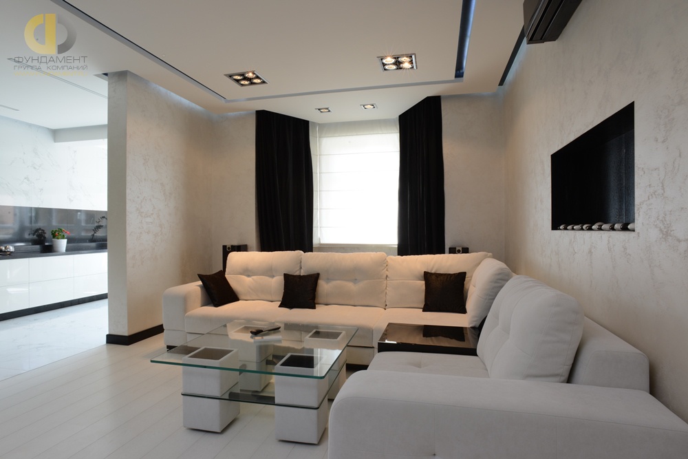 Das Wohnzimmer und die Küche stehen im Mittelpunkt der Haushaltsgeräte, so dass der High-Tech-Stil ideal für die Inneneinrichtung ist. Ein kleiner Raumbereich vergrößert sich visuell, dies wird zu den Glas- und Metalloberflächen beitragen, die Licht reflektieren. Gute Beleuchtung und eingebaute Strukturen werden dazu beitragen, den Raum weiter zu vergrößern.