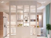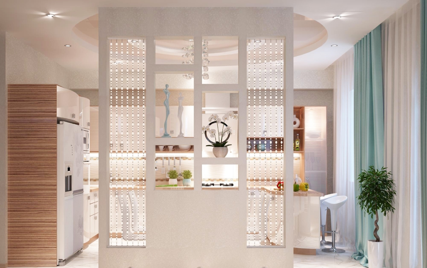- Trennung der Küche mit einer Gipskartonwand mit Regalen und Dekor in Form von Kristallperlen.