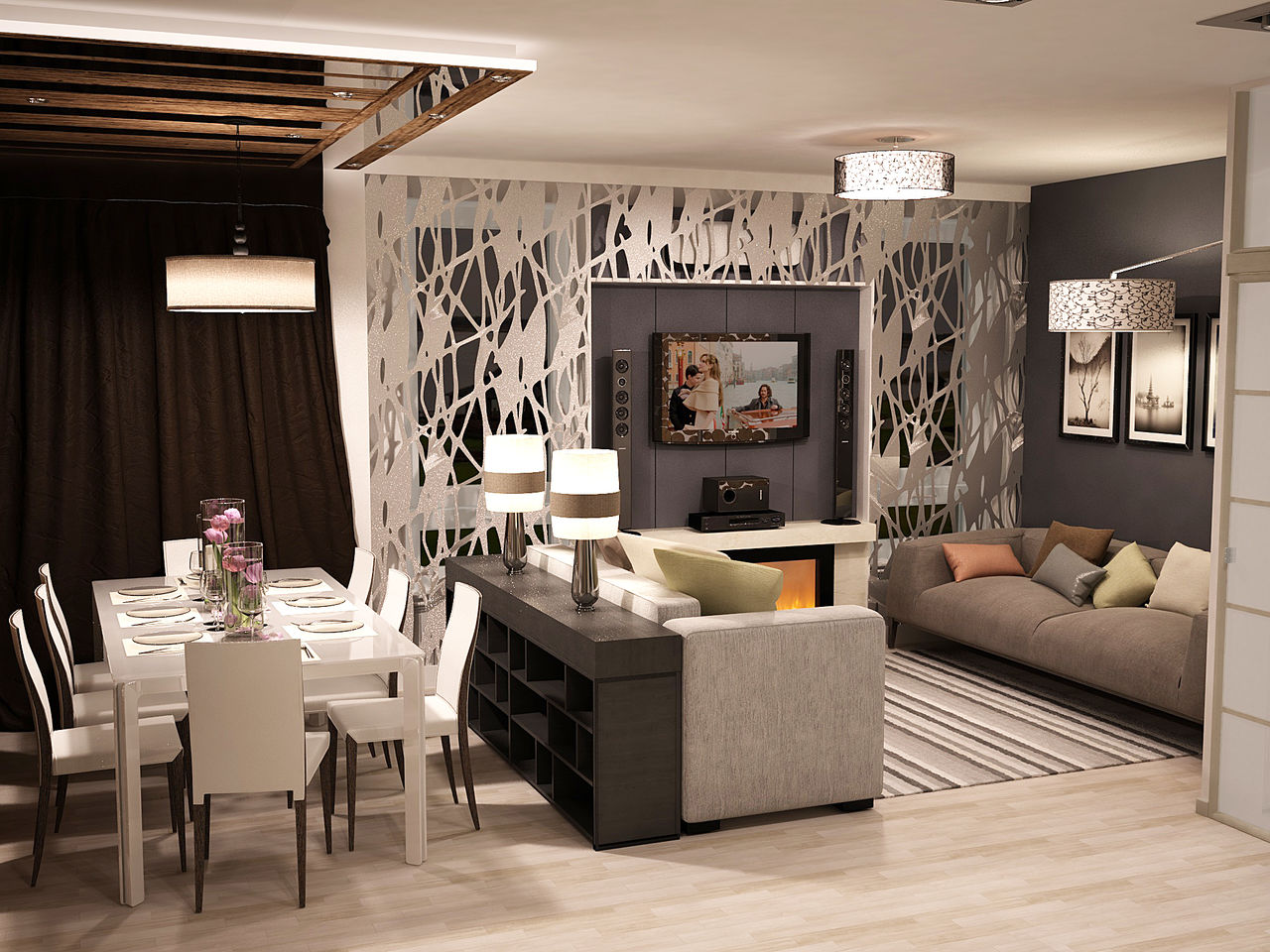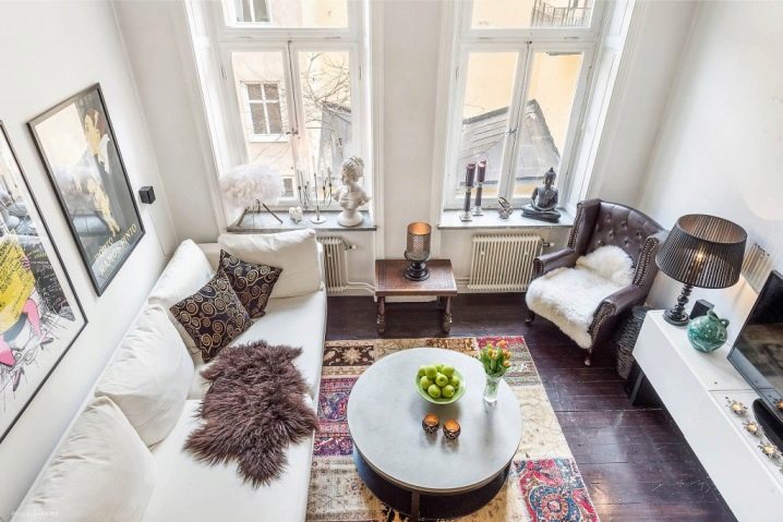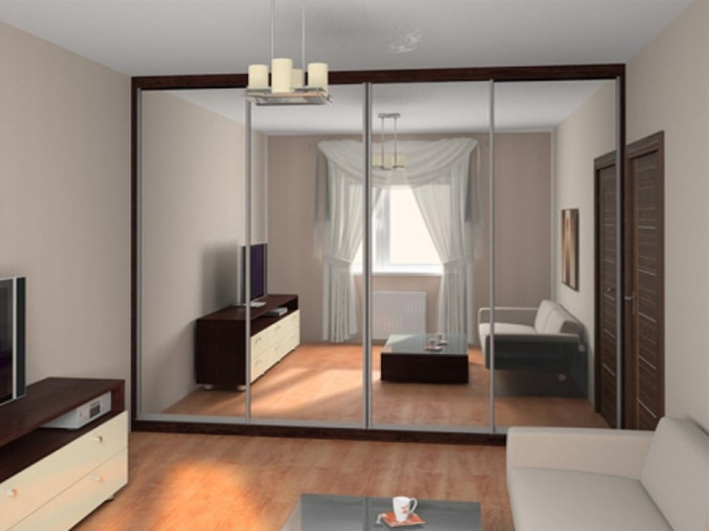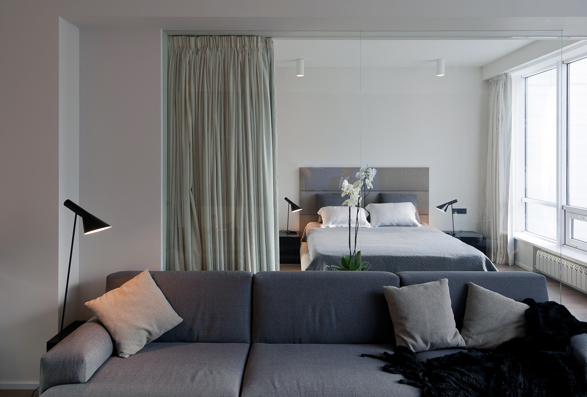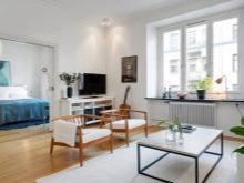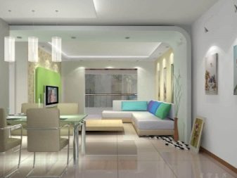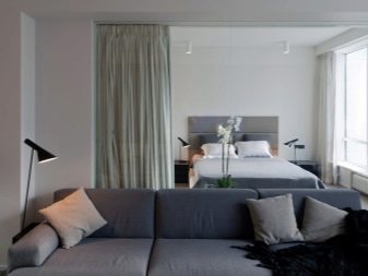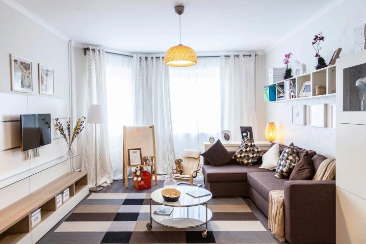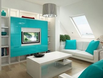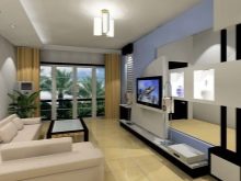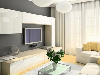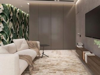 Für einen kleinen Raum ist es besser, das Finish in hellen Pastelltönen zu wählen. Möbel auf Beinen aufzuheben, so wirkt der Raum weniger belastet. Modulare Möbel sind auch eine gute Lösung, aber es ist am besten, Nischen für Speichersysteme vorzuorganisieren. Dieser Ansatz würde die Möbel in den Wänden "auflösen". Ecksofa - die sicherste Lösung, um Quadratmeter zu sparen.Sowie multifunktionale Schiebe Möbel.
