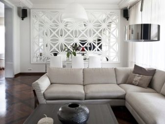 Literales Dekor schafft den Eindruck von Freiheit und erweitert optisch die Grenzen. Spiegel - einer der beliebtesten Empfänge von Designern. Eingerahmt in dekorative Rahmen sind sie nicht nur ein visuelles Hilfsmittel zur Erweiterung, sondern auch ein Ornament. Sie können oft Spiegelwände oder Glastrennwände zwischen den Zimmern und dem Flur finden.