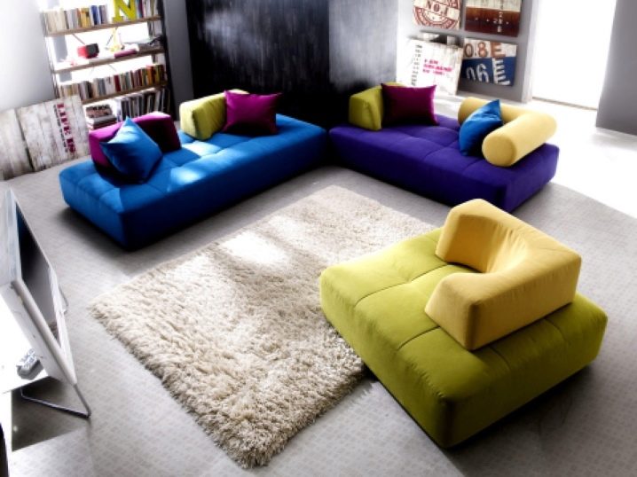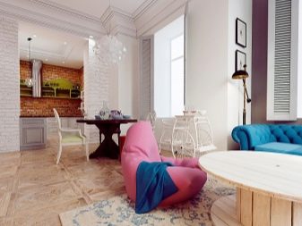 - Für kleine Räume können Sie anstelle eines großen Sofas rahmenlose Möbel aufnehmen, dies können weiche Sitzsäcke sein, Ottomanen, die bei Bedarf leicht neu arrangiert werden können.