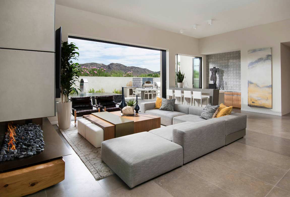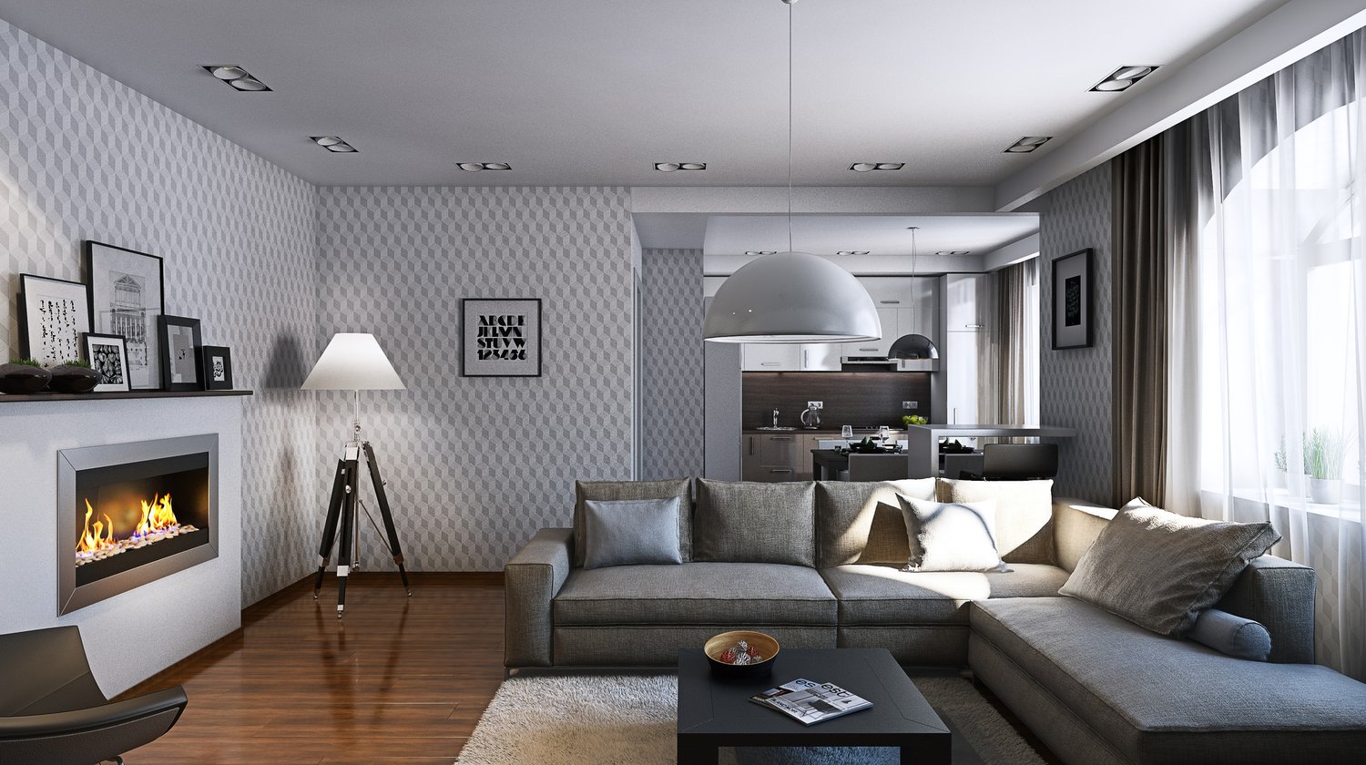 - Wohnzimmer kombiniert mit Küche in monochromem Grau, mit einem modernen Kamin.