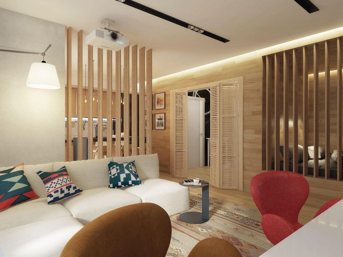 - Zoning mit Holztrennwänden, die den Küchen-, Flur- und Schlafzimmerbereich trennen.